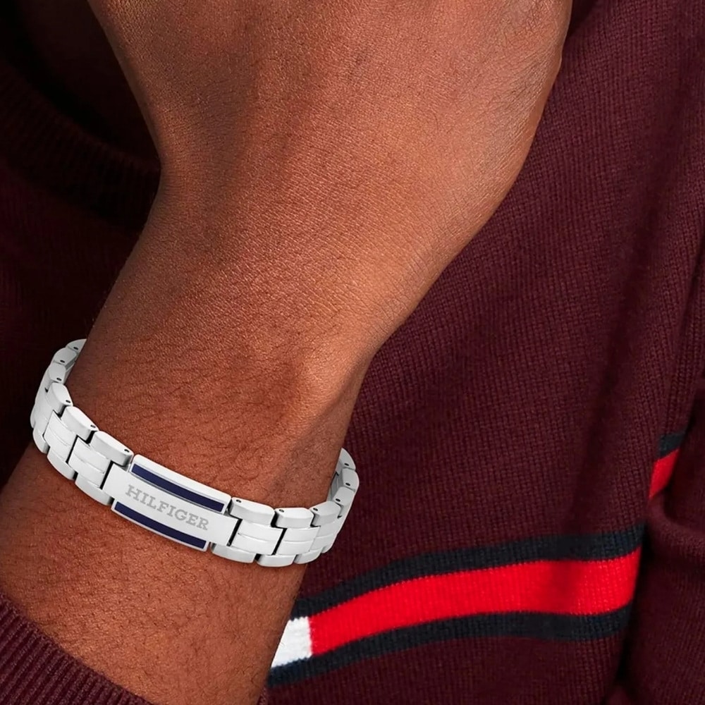Ανδρικό βραχιόλι χειροπέδα της Tommy Hilfiger από ανοξείδωτο ατσάλι , σε ασημί χρώμα. Έχει το λογότυπο της εταιρίας στο κεντρικό μοτίφ με μπλε σμάλτο στο επάνο και κάτω μέρος και αφαιρούνται κομμάτια από το μπρασελέ για να το προσαρμόσετε στον καρπό σας.